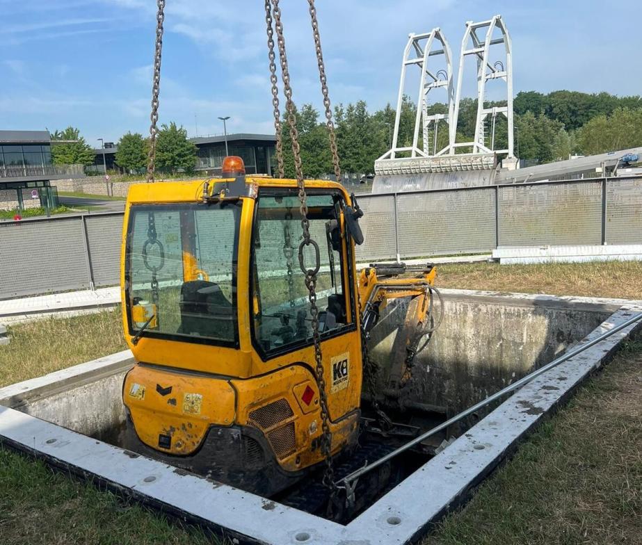 L’accès au bassin constitue un défi supplémentaire. La trappe technique, particulièrement étroite, ne laisse qu’une marge de manœuvre minimale. Chaque descente et remontée de matériel requiert une extrême précaution et une parfaite coordination avec le grutier et les techniciens positionnés vingt-cinq mètre plus bas. Pour répondre à ce besoin Séché Assainissement a mobilisé des moyens matériels spécifiques :